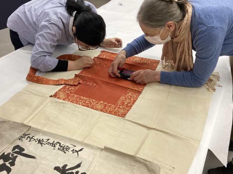 《法服(紅鈍色緞子牡丹唐草地模様)への紋(丸ニ三ツ葵)仕様書》 千總文化研究所は、中世日本研究所、京都府京都文化博物館の研究者と共に法衣装束の調査を進めています。千總が「御装束師千切屋惣左衛門」として真宗大谷派宗務所(東 … 続きを読む 法衣装束の共同研究