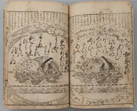 絵画や染織、漆工、金工など幅広い美術分野に影響を及ぼした和歌ですが、出版にもその足跡は残されています。江戸時代には三十六歌仙や百人一首、古典的物語の中の歌といった形で、和歌は版本を通して大衆にも浸透していました。